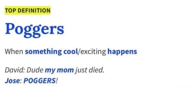 This one originated from online gaming. Jan 22, 2021 · "poggers", "pog" or "pog champ" is the 4 th new word on this years' list. So, what is a pogger? What exactly is a pogger? Its an emote on twitch.tv thats usually is supposed to symbolize hype or excitment
